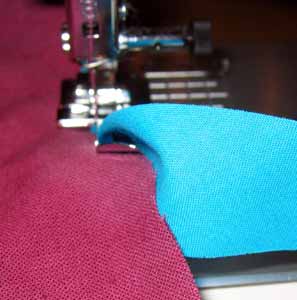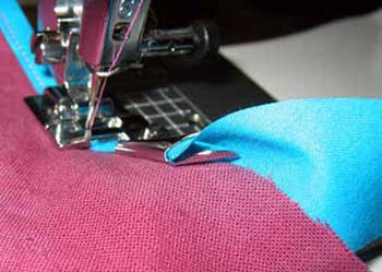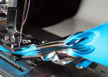 Das Schrägband muss beim Nähen gleichmäßig ablaufen kännen. Der Stoff muss immer bis zum Anschlag im Schlitz des Füßchens liegen.